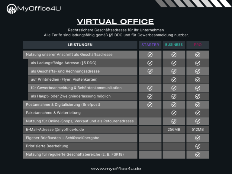 Zusätzlich erhalten Sie eine eigene E-Mail-Adresse mit @myoffice4u.de sowie erweiterte Nutzungsmöglichkeiten für Printmedien.