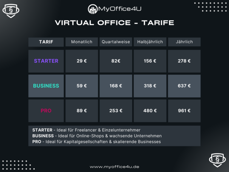 Alle Tarife beinhalten eine rechtskonforme, ladungsfähige Geschäftsadresse in Deutschland gemäß §5 DDG.